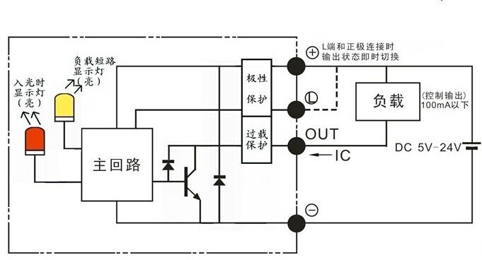 ● “L”引線與“+”引線相接時,輸出狀態即時轉換如:設傳感器現態為受光時指示燈亮、“out”沒有輸出電流,相接后指示燈仍亮、但“out”有輸出電流。其它各引腳接線錯誤時,傳感器不工作,但傳感器本身不會損壞;